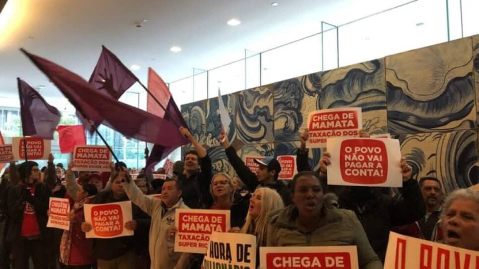 O advogado Felipe Vono, assessor parlamentar da deputada estadual Ediane Maria (Psol) de São Paulo, integrou a manifestação da Frente Povo Sem Medo, que ocorreu na sede do Itaú BBA, na avenida Faria Lima, em São Paulo, na quinta-feira (3.jul.2025).