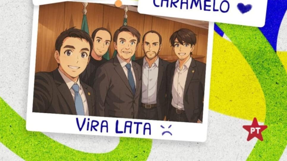 A legenda oficial do PT em sua conta no X publicou imagens produzidas por inteligência artificial que vinculam a imagem da família Bolsonaro a uma expressão depreciativa, qual seria “vira-lata que não tem nem identidade nem coragem”.