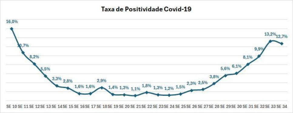 O índice de positividade atingiu 13,2%, o mais elevado desde março do ano em curso. A média móvel de cinco semanas sustenta a tendência de crescimento.