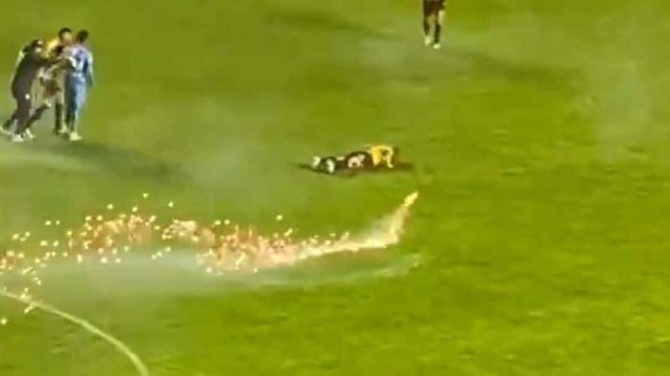 Ato lamentável e vergonhoso de um grupo da torcida sul. Arremessaram foguetes ao campo de jogo, um atingiu e derrubou Juan Godoy.