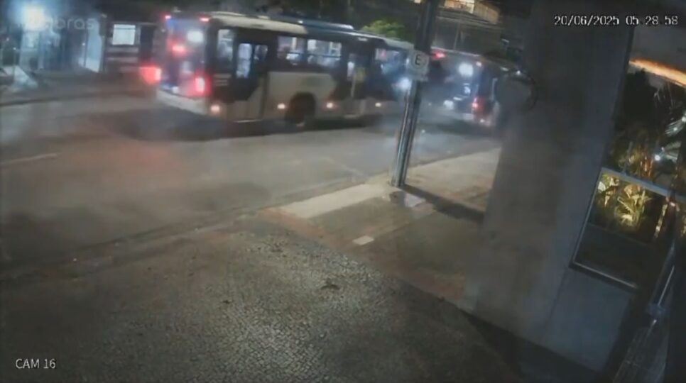Câmeras de segurança registraram o instante do acidente. A colisão ocorreu em um dos cruzamentos do bairro. As imagens mostram que um dos ônibus parou antes do cruzamento e, em seguida, o ônibus que vinha em frente tentou desviar, mas acabou atingindo a traseira e a lateral do coletivo.