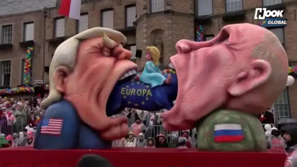 Outra alegoria em Düsseldorf satirizava o financista Jeffrey Epstein, acusado de crimes sexuais. A obra apresentava o personagem com a frase “Todos protegem o agressor” à esquerda e “Todos ignoram as vítimas” à direita, gerando controvérsia. Em Colônia, um carro alegórico destacava a imagem da bunda do presidente Trump, adornada com marcas de beijos de políticos europeus, incluindo Fridrich Merz e Emmanuel Macron, presidente da França.