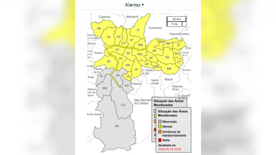 A Defesa Civil de São Paulo emitiu um alerta nesta quarta-feira (18) sobre a possibilidade de chuvas intensas na capital, especialmente nas Zonas Oeste e Norte. O Centro de Emergências Climáticas (CGE) também colocou bairros dessas regiões em estado de atenção, devido ao risco de alagamentos e rajadas de vento.