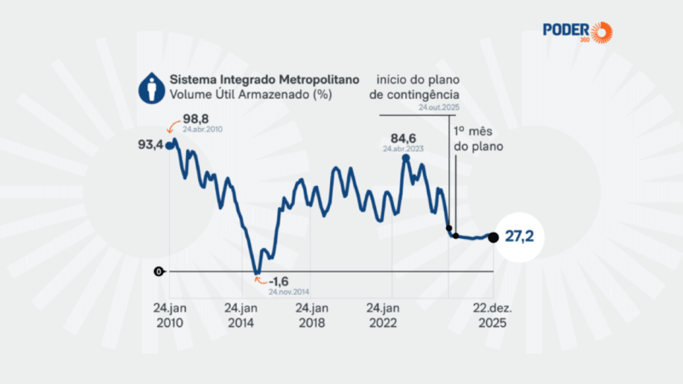 Em outubro de 2025, a Agência Reguladora de Serviços Públicos do Estado de São Paulo (Agesp) lançou um plano de contingência com o objetivo de diminuir o consumo de água. No entanto, o nível do “Sistema Integrado Metropolitano” (SIM) já apresentava uma situação crítica, com apenas 28,7% do “volume útil” disponível.