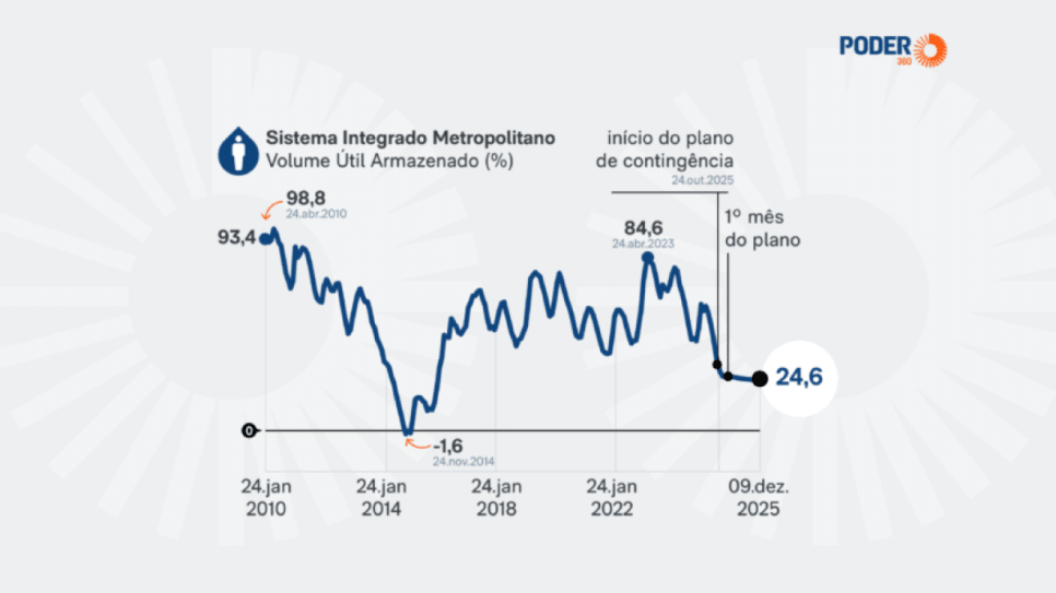 A Sabesp, empresa de abastecimento privatizada em julho de 2024, é responsável pela implementação dessa medida. A elevação para 12 horas de redução de pressão será adotada caso o nível do sistema integrado caia abaixo de 22,8%. O “volume útil” representa a diferença entre o volume total de água e o “volume morto”, que fica abaixo do nível de captação e só pode ser acessado por bombeamento.