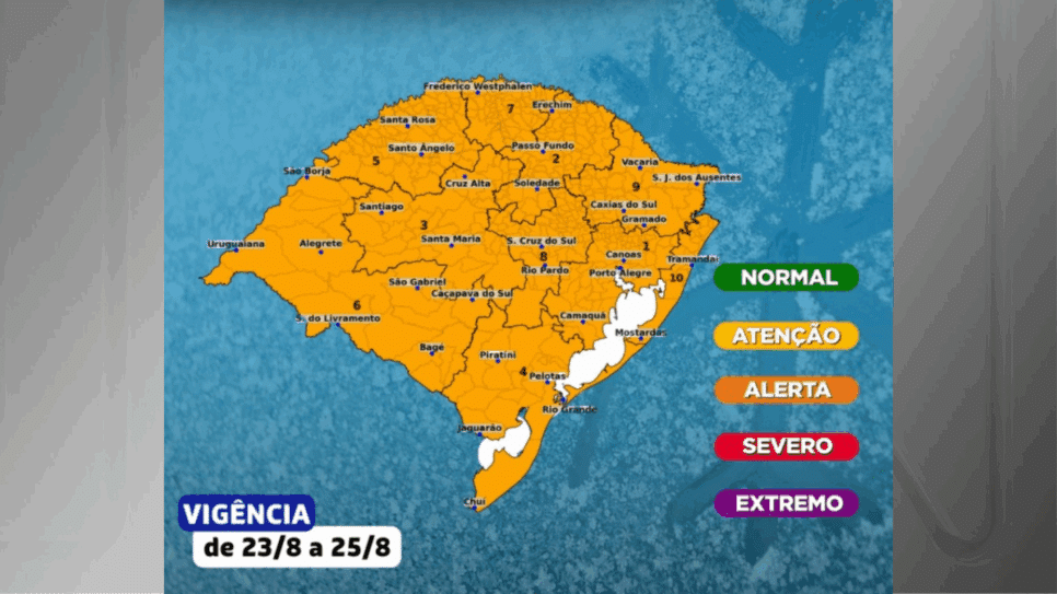 A previsão indica que o Rio Grande do Sul registrará queda nas temperaturas entre sábado (23) e segunda-feira (25), em razão da influência de uma massa de ar frio de origem polar. Estão previstas condições para geadas e temperaturas mínimas negativas em diversas áreas do estado.