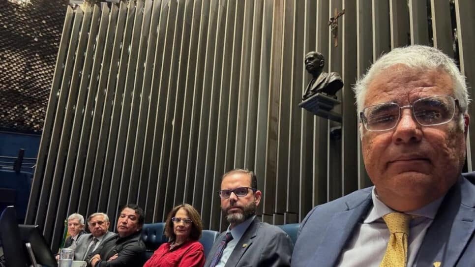 O senador Eduardo Girã (Novo-CE) publicou, no início da tarde, uma foto em que está sentado à mesa da Presidência da Casa, ao lado dos senadores Magno Malta (PL-ES), Damares Alves (Republicanos-DF), Jorge Seif (PL-SC), Izalci Lucas (PL-DF) e Jaime Bagattoli (PL-RO).