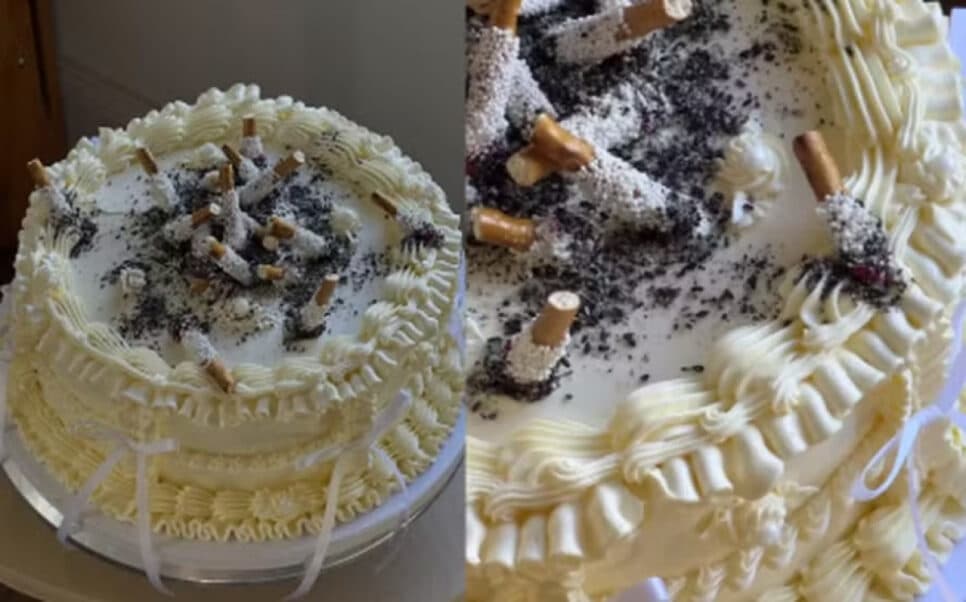 O bolo, assinado pela A Tiny Kitchen NYC, apresenta uma combinação inusitada de ingredientes. As bitucas de cigarro foram feitas com pretzels, enquanto a base do bolo é coberta com chocolate branco, confeitos coloridos e “cinzas” criadas com gergelim preto.