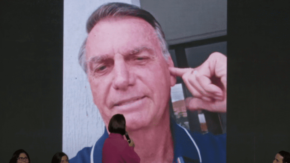O ex-presidente Jair Bolsonaro (PL) participou por vídeo neste sábado (5.jul.2025) de evento do PL Mulher, que ocorreu em Guarulhos (SP), com a presença de sua esposa, Michelle Bolsonaro.
