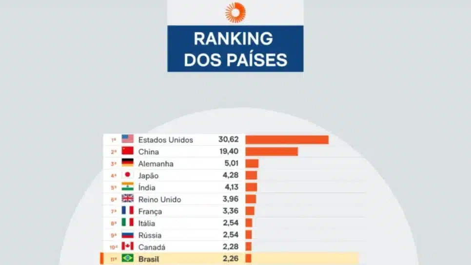 O topo do ranking global permaneceu relativamente estável, com os Estados Unidos liderando com US$ 30,62 trilhões, seguido pela China com US$ 19,40 trilhões e pela Alemanha com US$ 5,01 trilhões. No entanto, houve uma mudança importante na quarta posição, com o Japão retomando o posto com US$ 4,28 trilhões, superando a Índia, que ocupava a segunda colocação no segundo trimestre de 2025.