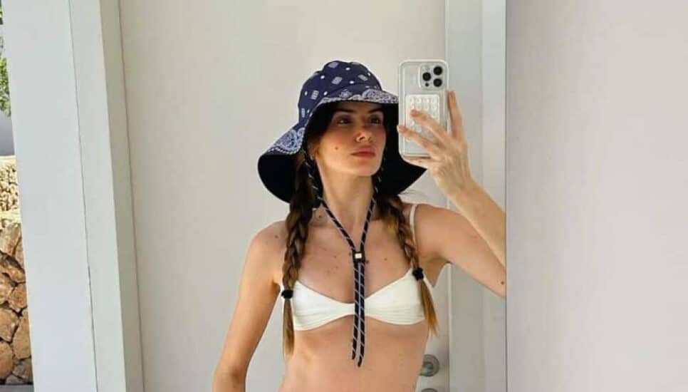 A atriz Camila Queiroz, 32 anos, compartilhou uma série de imagens em Ibiza, na Espanha, mostrando sua barriga de gestante.