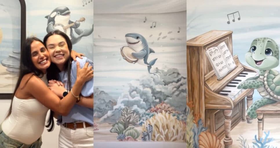 O quarto do Bento está se finalizando, escreveu Carol Peixinho. Além da decoração inspirada no fundo do mar, o cômodo homenageia a canção “Falta Você”, do pagodeiro.