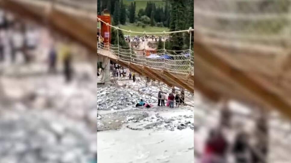 Uma ponte suspensa em uma atração turística em Xinjiang, no noroeste da China, desabou na quarta-feira (6), resultando na queda de 29 pessoas e na morte de cinco, de acordo com informações oficiais.