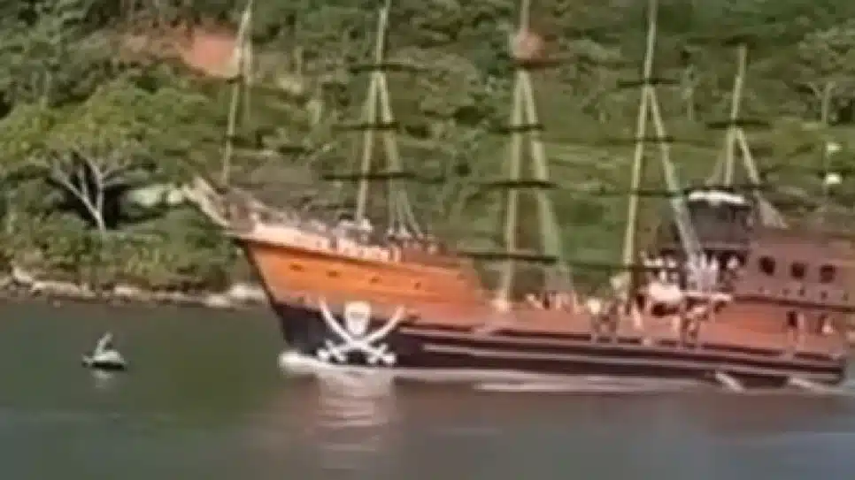 Um navio que simula um barco pirata colidiu com um casal que estava em uma moto aquática em Balneário Camboriú, no litoral de Santa Catarina, neste domingo (15). O Grupo Barco Pirata tomou conhecimento do incidente por meio de um vídeo que circula nas redes sociais.