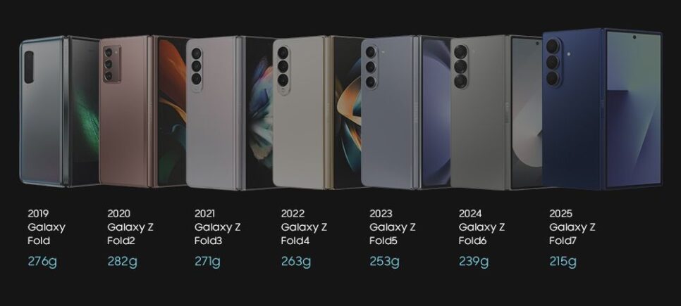 Lançado em julho de 2025, o Galaxy Z Fold7 é 48% mais fino que o modelo original e 26% mais fino que o seu antecessor. O aparelho possui apenas 8,9 mm fechado e 4,2 mm aberto, um novo recorde para smartphones dobráveis.