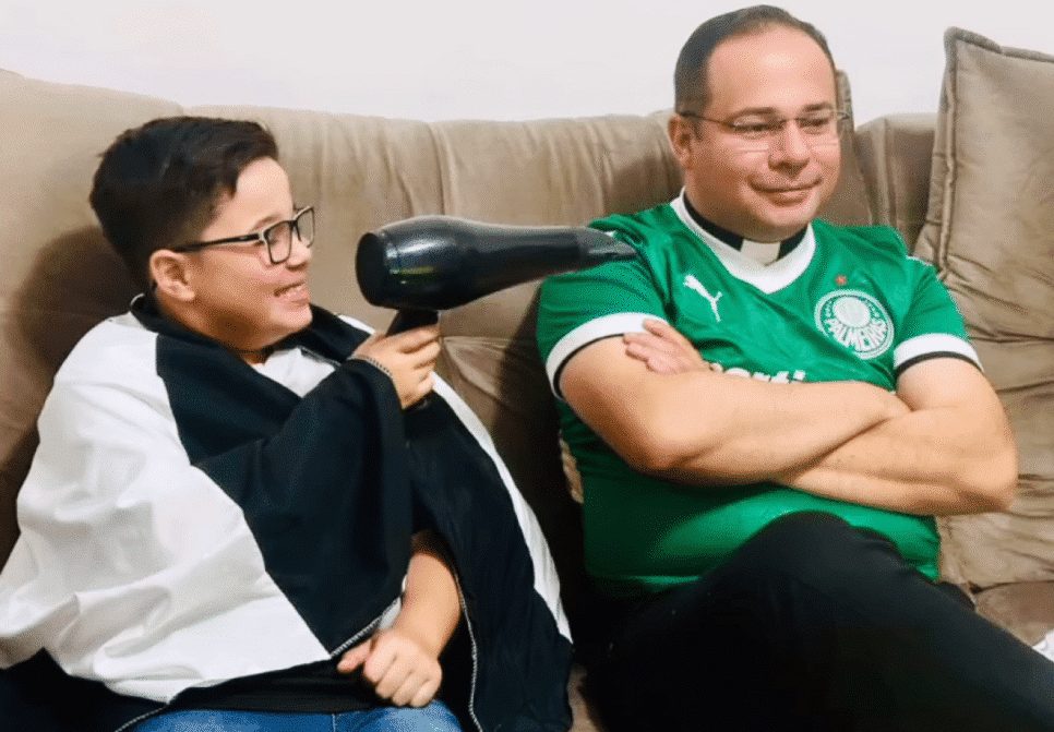 Com o secador de cabelo nas mãos, o menino postou fotos do momento em que viram o jogo acompanhado da paródia “O Palmeiras não tem mundial”. “A prece funcionou, Jesus me ouviu”, brincou Enzo e, em resposta, o padre respondeu que “ainda dá para tentar, filho?”.