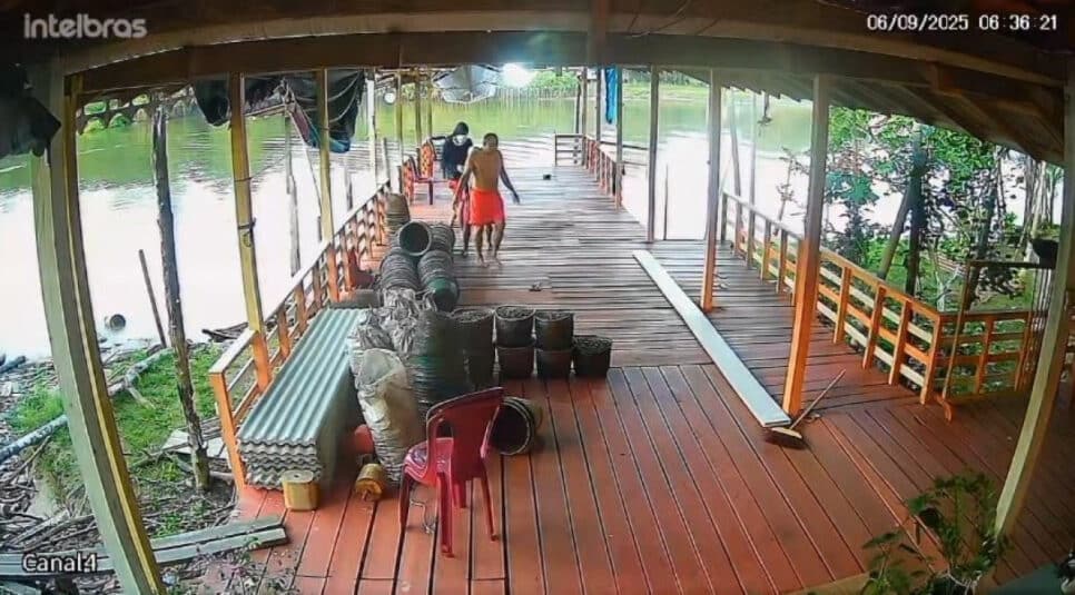 As câmeras de segurança da residência registraram o assalto, evidenciando o momento em que três indivíduos entraram no local e sequestraram um morador durante a ação.