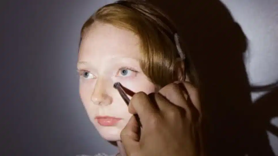 A sobrancelha reta foi um grande destaque no desfile da Givenchy. Essa forma proporciona um olhar mais alongado e sofisticado. O truque consiste em preencher a sobrancelha, esticando um pouco mais o final, e aplicar corretivo de forma reta na parte inferior. Isso cria um efeito de lifting instantâneo, alongando o olhar e conferindo um ar moderno.