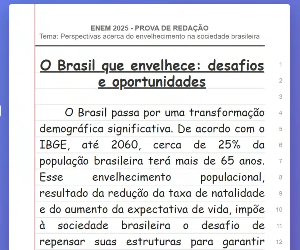 A reportagem solicitou a três inteligências artificiais que elaborassem uma redação com o tema do Enem deste ano: “perspectivas acerca do envelhecimento na sociedade brasileira”. As IAs ChatGPT, Claude e DeepSeek receberam as mesmas instruções e limitações que os candidatos tiveram na prova oficial, incluindo o limite de 30 linhas e a necessidade de um título e linha fina.