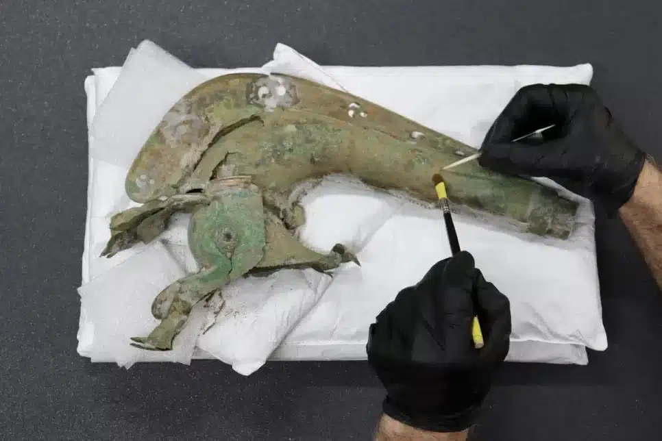 Os carnyces, instrumentos de bronze com cabeças de animais, eram utilizados por tribos celtas em toda a Europa para motivar suas tropas em batalhas. O exemplar encontrado é uma das versões mais completas já registradas na Europa, conforme comunicado do órgão nacional de patrimônio Historic England.