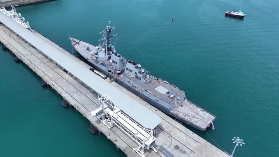 Aeronaves equipadas com drones capturaram, no domingo (31), o contratorpedeiro de mísseis guiados USS Sampson DDG-102 da Marinha dos EUA amarrado próximo à entrada do Canal do Panamá. A imagem foi obtida em um contexto de significativo deslocamento de forças navais americanas na região do Caribe e suas proximidades.