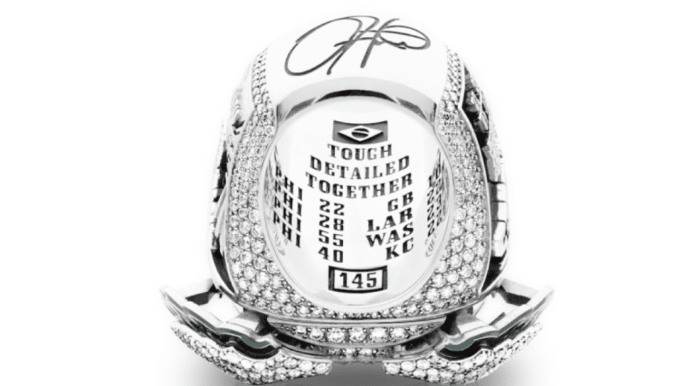 O anel exibe os resultados de todas as vitórias nos playoffs contra os Packers, Los Angeles Rams, Washington Commanders e Chiefs. Além da bandeira brasileira, o adorno compreende outros elementos importantes, como o lema “Foco, Detalhe, União” do treinador Nick Sirianni, o brasão da equipe e dois troféus Vince Lombardi, que simbolizam as duas conquistas da equipe na NFL (National Football League). No lado frontal, está a inscrição “Campeões Mundiais”.