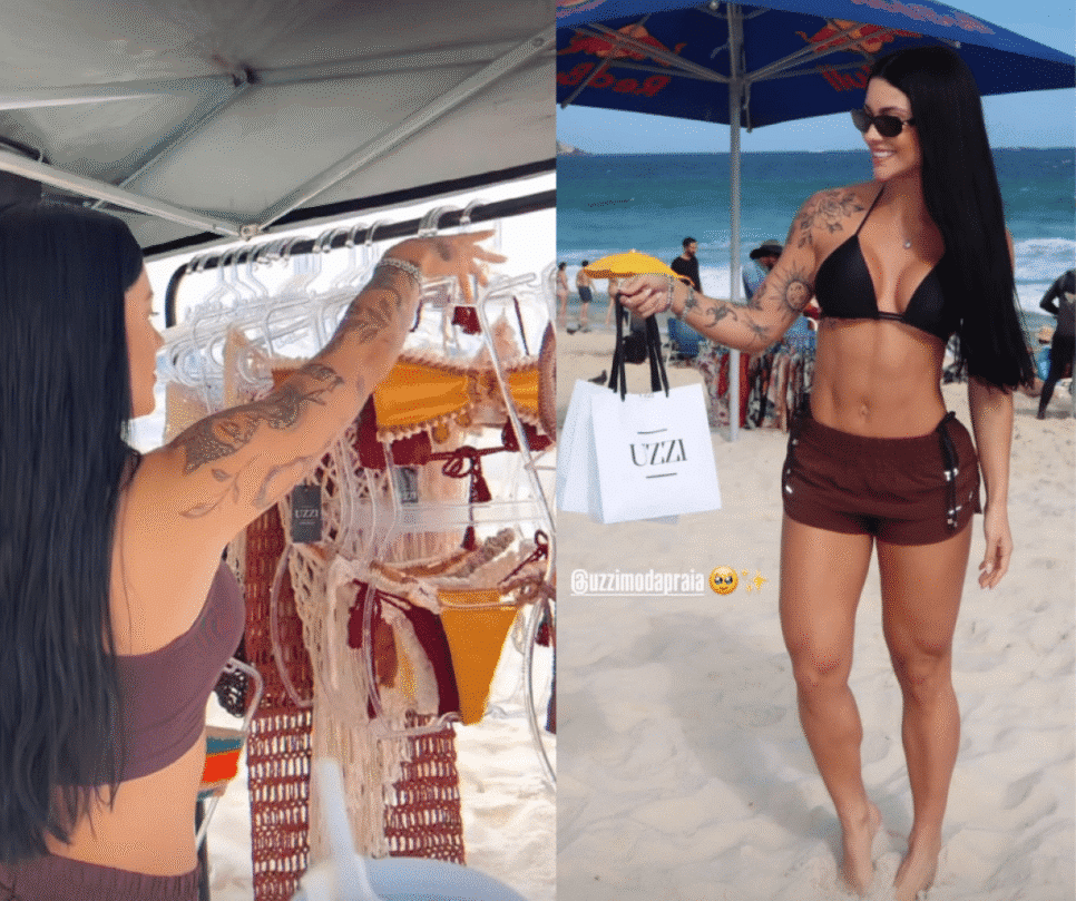 A influenciadora digital e empresária Rayane Figliuzzi, de 27 anos, namorada do cantor Belo, de 51, foi vista no sábado (12) comercializando biquínis na praia da Barra da Tijuca, na zona oeste do Rio de Janeiro. Dona da marca de beachwear Uzzi, ela integrou a montagem do stand para apresentar as peças, interagiu com o público e auxiliou nas vendas.