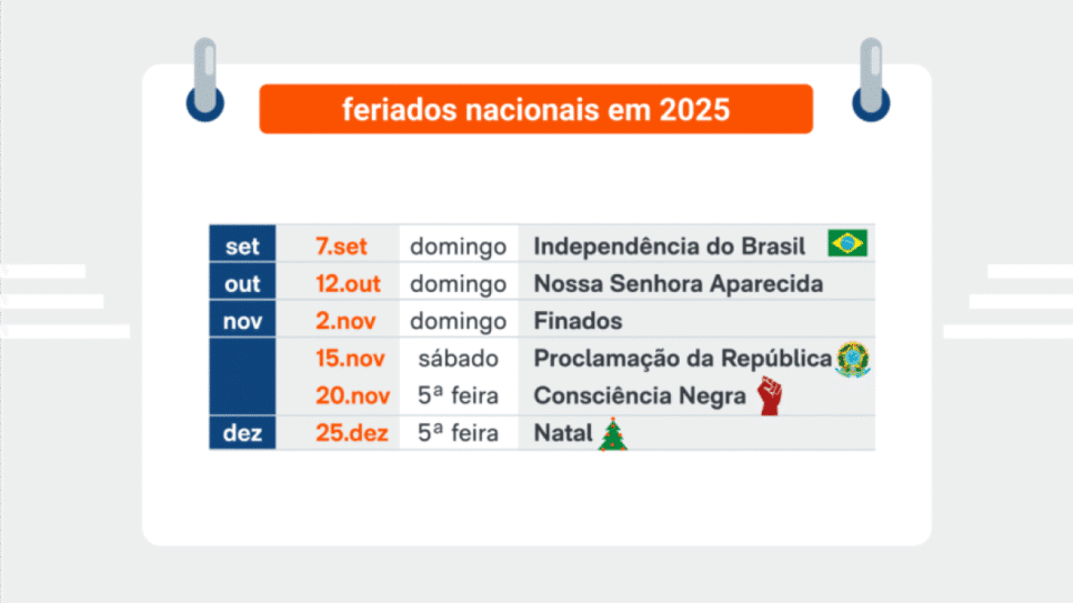 O Brasil contará com 6 feriados nacionais no segundo semestre de 2025. Três desses dias ocorrerão aos domingos, dois na quinta-feira e um no sábado. Assim, apenas um poderá ser aproveitado para prolongamento.