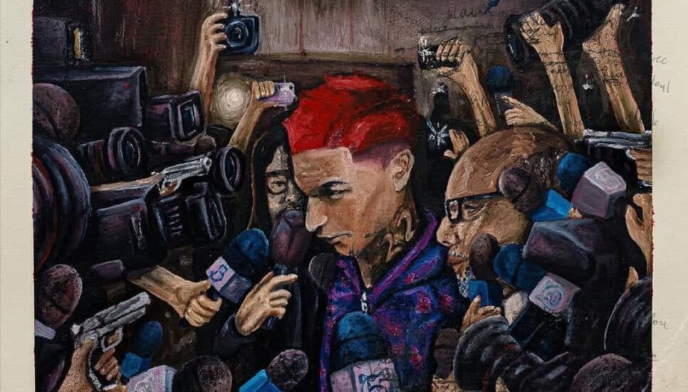 A imagem retrata a experiência de Oruam. Envolvido por microfones, câmeras e armas, a obra espelha a exposição pública e o julgamento que o artista teve recentemente.