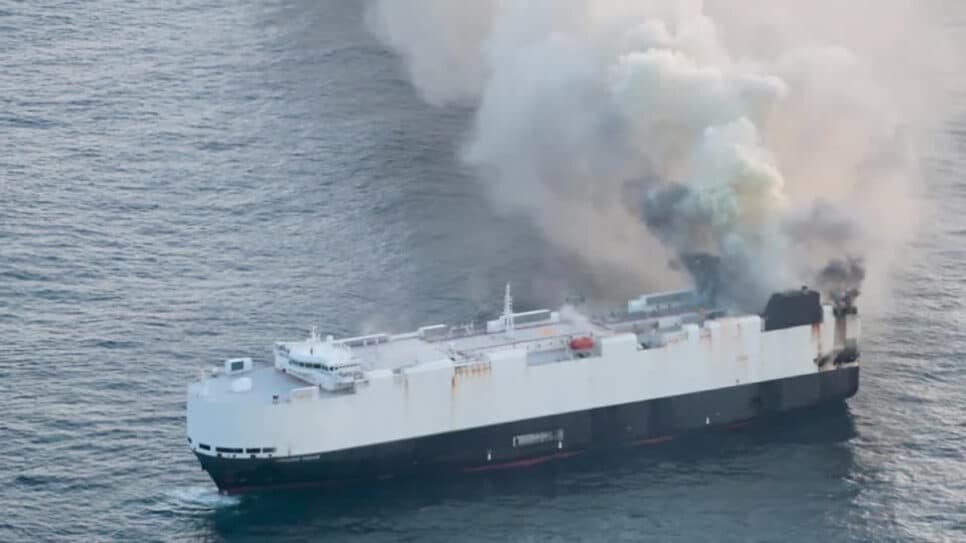 A fumaça foi notada primeiro subindo de um cargueiro transportando veículos elétricos, informou a empresa. Não se sabe com certeza a marca dos veículos que o navio estava carregando. Os incêndios envolvendo veículos elétricos em navios são difíceis de extinguir devido ao calor gerado e ao risco de reacendimento, que pode durar vários dias.