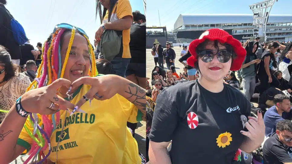 A jovem explicou: “O clima está tranquilo, a galera é legal aqui. Está todo mundo muito bacana”. Adicionou: “Talvez eu vá ao banheiro antes do show da Iza às 15h50 no Skyline”.