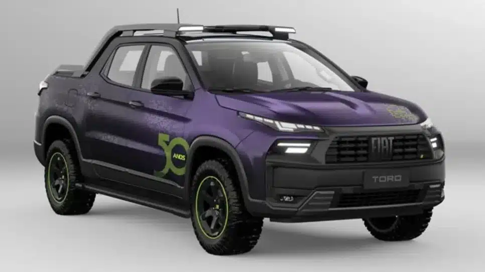 A Fiat marcou presença no Lollapalooza Brasil 2026, celebrando 50 anos de história no mercado brasileiro com uma versão especial da Toro. A picape recebeu uma série de modificações que a transformaram em um modelo conceitual, destacando-se pela sua pintura roxa com efeito degradê, que simboliza a jornada da marca ao longo dos anos.