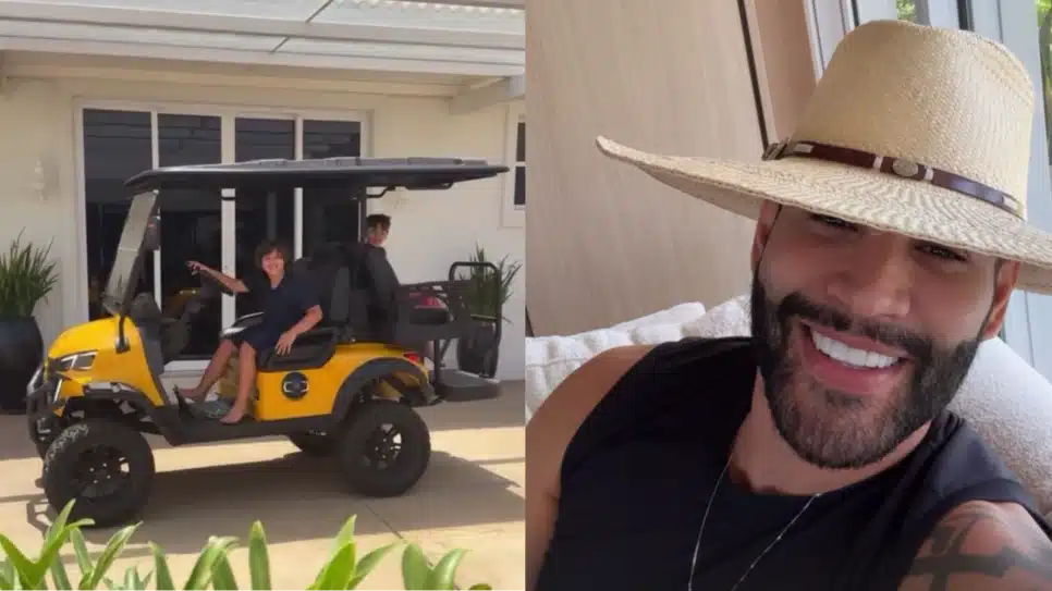 O cantor Gusttavo Lima, de 36 anos, publicou um vídeo em suas redes sociais nesta segunda-feira (13), onde seu filho mais velho, Gabriel, de 8 anos, aparece dirigindo um carrinho de golfe na propriedade da família. No registro, o filho mais novo, Samuel, de 6 anos, também está presente no veículo, que possui uma caixa de som embutida. “O que é isso?”, brincou o pai no vídeo.