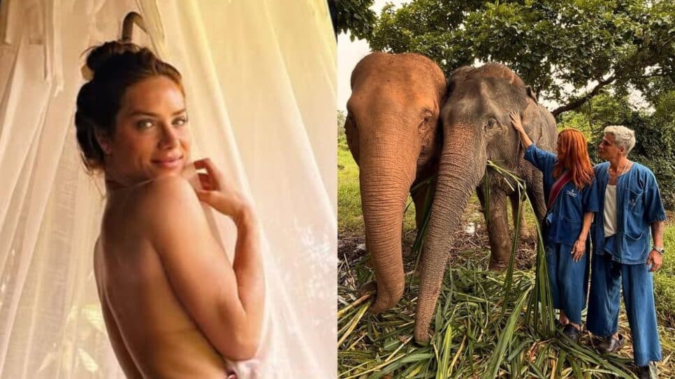 Ewbank registra-se em ambientes naturais, tomando banho de banheira, exibindo corpo nua, interagindo com elefantes e degustando a gastronomia local em companhia do marido.