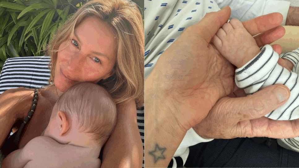 Gisele Bündchen, 45 anos, publicou uma sequência de imagens e mostrou fotos com sua filha mais nova. O bebê nasceu em fevereiro deste ano e é resultado do relacionamento com o lutador de jiu-jitsu Joaquim Valente, 35.