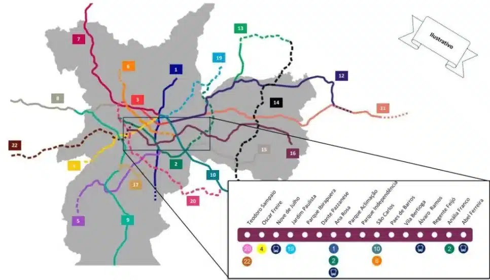 As estações da Linha 16-Violeta incluem: Teodoro Sampaio, Oscar Freire, Jardim Paulista, Parque Ibirapuera, Dante Pazzanes, Ana Rosa, Parque Aclimação, Parque Independência, São Carlos, Paes de Barros, Vila Prudente, Álvaro Ramos, Resende Feijó, Anália Franco e Abel Ferreira.