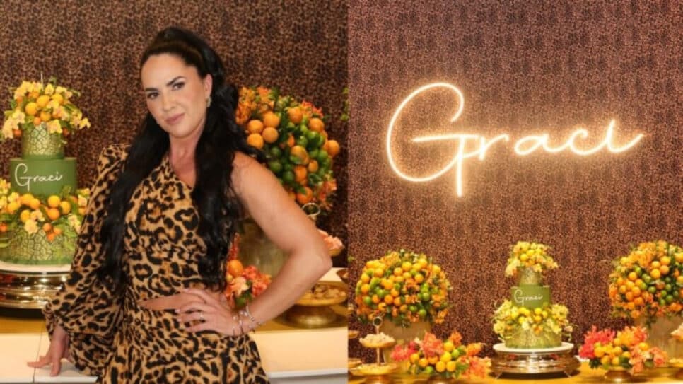 A influenciadora optou por um visual marcante, utilizando um vestido longo com estampa animal print, que também inspirou a decoração do espaço. O local foi cuidadosamente decorado com flores, frutas e elementos que reproduziam a padronagem do vestuário de Graciele.