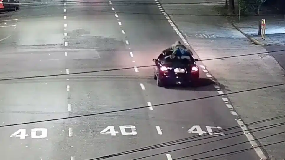 Um indivíduo foi visto em cima de um automóvel em deslocamento em uma via de Caxias do Sul, na Região Serrana do Rio Grande do Sul. A ocorrência foi capturada por sistemas de vigilância da cidade, às 4h20 do último domingo (14).