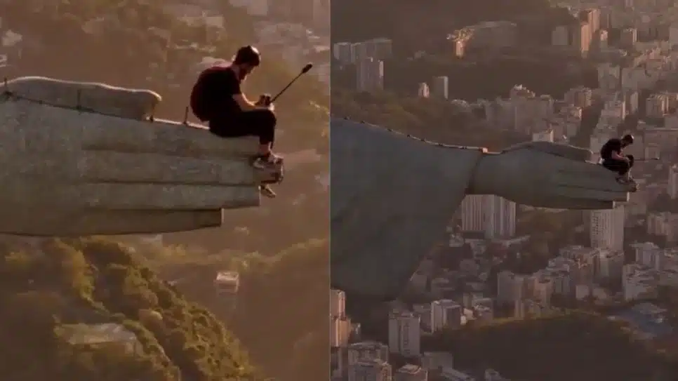 Um guia turístico, que acompanhava um grupo e utilizava um drone para filmar o passeio, capturou a cena em que um dos homens se senta no braço direito do monumento antes de saltar.