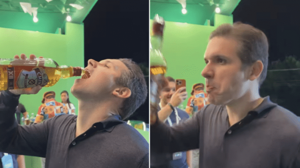 Beba com cuidado. Cuidado. Não se trata de moderação, não, afirma Fabiano antes de beber diretamente da garrafa. Em seguida, Motta faz o mesmo a gritos. “Eita, que parada!”, diz Renan da Resenha. Motta sorri.