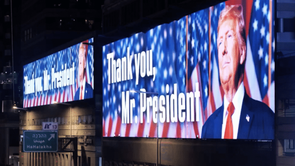 Na avenida principal de Tel Aviv, no domingo (22 de junho de 2025), duas telas exibiam uma imagem do presidente dos Estados Unidos, Donald Trump (Partido Republicano), juntamente com a frase “Obrigado, Sr. Presidente”.