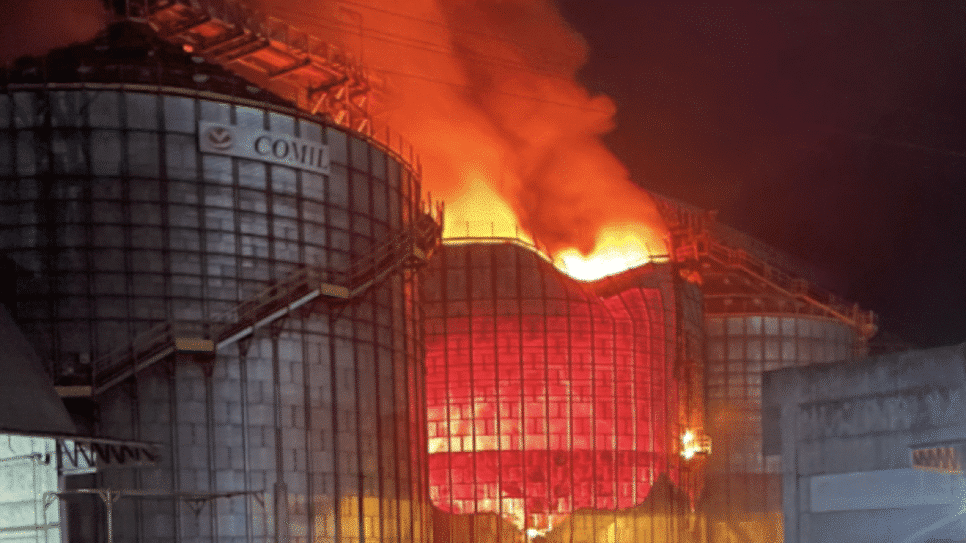 Um incêndio de grandes dimensões atinge, desde sexta-feira (11.jul.2025), um armazém de grãos de uma empresa, às margens da BR-116, próximo à cidade de Arroio Grande, no sul do Rio Grande do Sul.