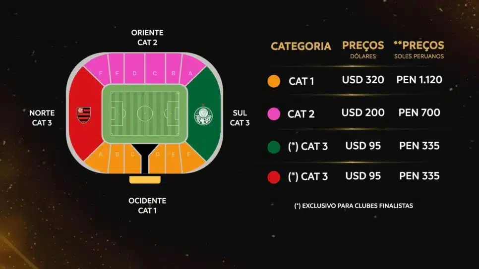 - Categoria 3: USD 95 / PEN 335* (disponíveis apenas para torcedores dos clubes finalistas)
