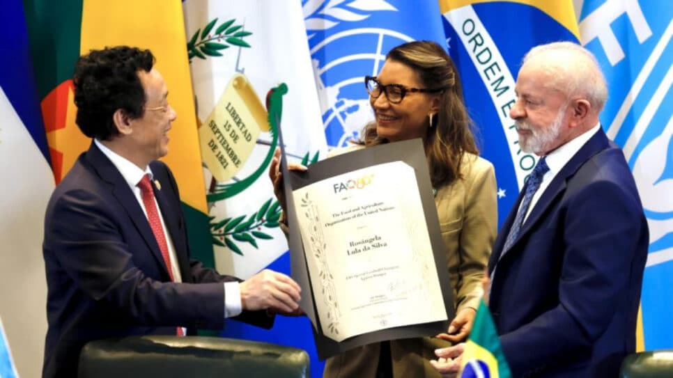 O diplomata chinês Qu Dongyu, diretor-geral da FAO, formalizou a homenagem, reconhecendo o trabalho de Janja em parceria com a organização no combate à insegurança alimentar.