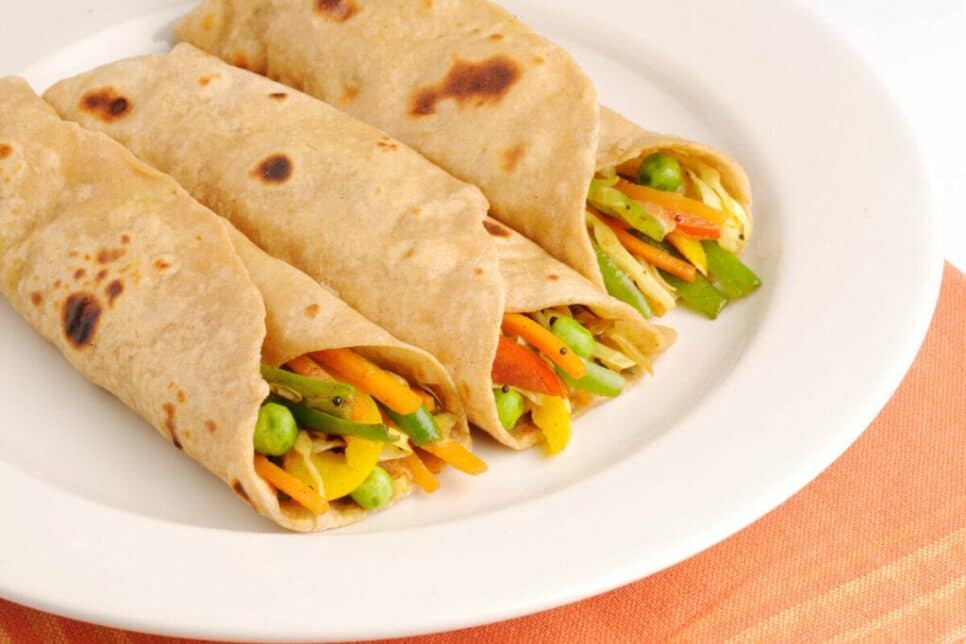 Em um recipiente, adicione todos os legumes e misture bem. Tempere com sal e pimenta-do-reino. Em seguida, utilize uma colher para rechear as panquecas com a mistura e enrole-as. Sirva-as logo em seguida.