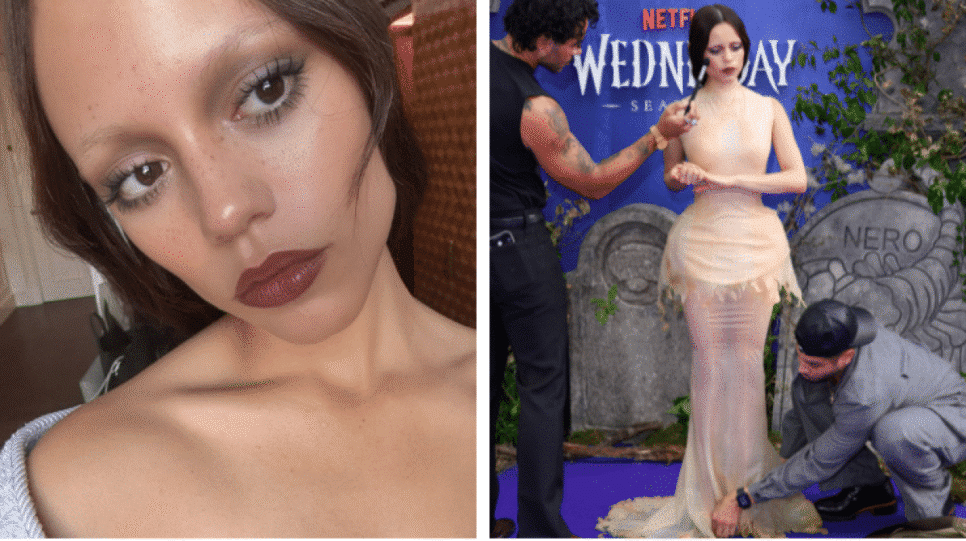 Para a ocasião, ela selecionou um vestido nude da coleção de Alta-Costura Outono 2025 da Ashi Studio, uma grife francesa. Apesar do visual claro, o tom “sombrio” marcante da série foi refletido na beleza de Ortega, que escolheu uma maquiagem de sobrancelha descolorida, olhos escuros e esfumados e um batom vinho escuro. A técnica conhecida por “method dressing” consiste na encarnação literal do personagem através da roupa, trazendo a estética da obra para a composição. Jenna Ortega utilizou o método anteriormente, como em “Beetlejuice”.