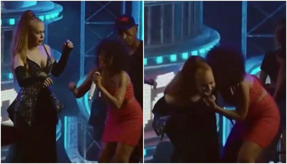 A cantora Joelma, de 51 anos, removeu um microfone e aplicou uma força com a mão após ser convidada por uma fã a subir ao palco, e o vídeo está se tornando viral nas redes sociais.