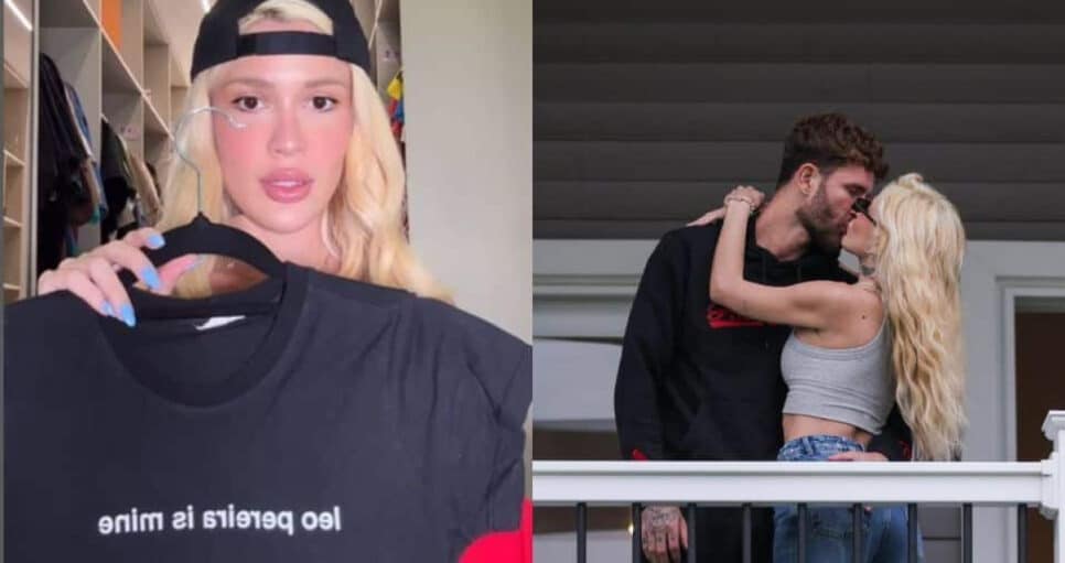 Ela exibiu em um vídeo divulgado para seus seguidores a escolha de um recorte preto com a frase “Léo Pereira é meu”, redigida em inglês.