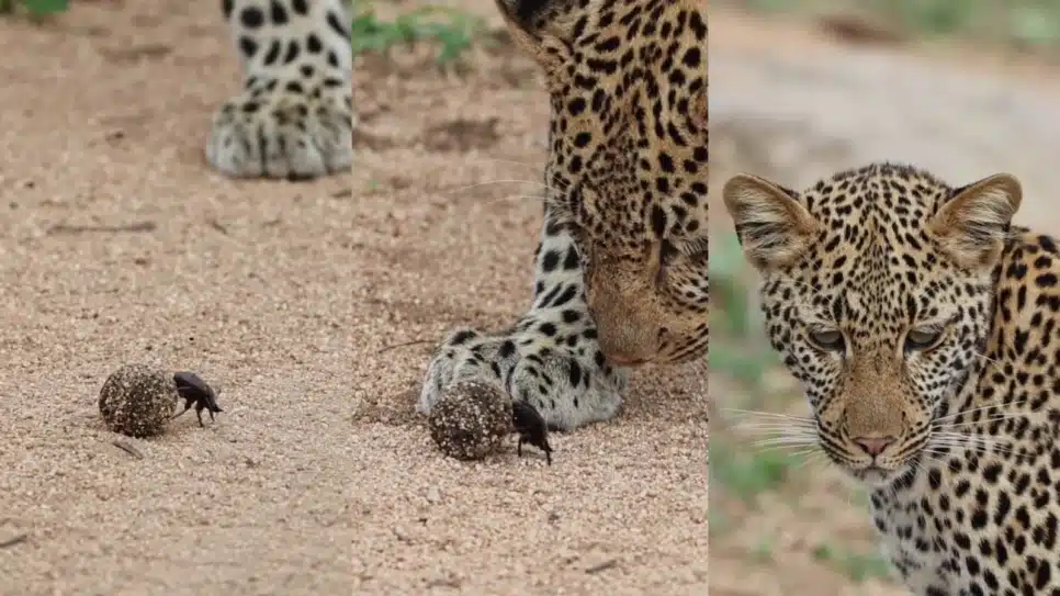 O fotógrafo de vida selvagem Nick Kleer capturou um momento extraordinário durante uma de suas expedições: um leopardo interagindo com um besouro rola-bosta em um safari na África. Esses insetos, conhecidos por sua busca por esterco de herbívoros como vacas e elefantes, utilizam suas antenas em forma de remo para moldar o material.