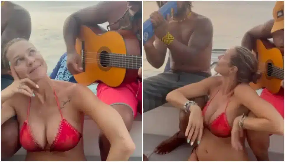 A atriz Luana Piovani, 49 anos, realizou um passeio de barco em Fernando de Noronha na quinta-feira passada (11) e recebeu uma canção especial.